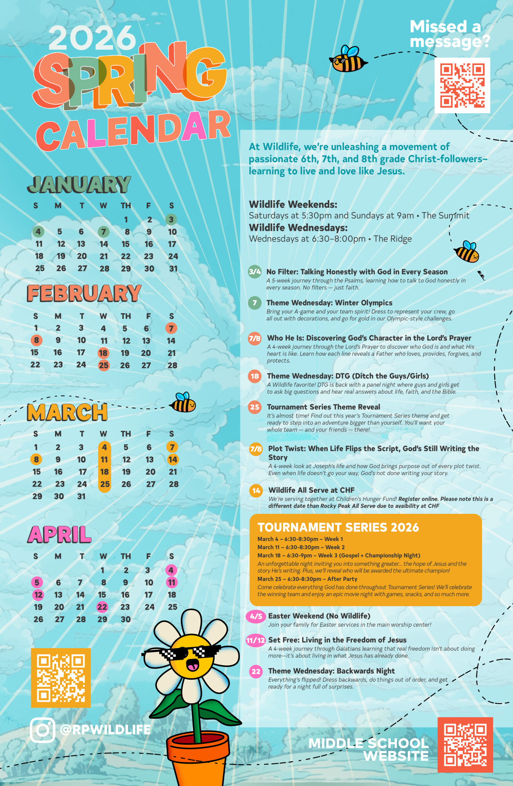 Wildlife is the Middle School Ministry at Rocky Peak—designed just for 6th, 7th, and 8th graders. Whether it’s your first time visiting or you’ve been with us for a while, you belong here! Our goal is to create a safe, fun, and engaging space where students can build friendships, ask real questions, grow in their faith, and discover what it means to follow Jesus.